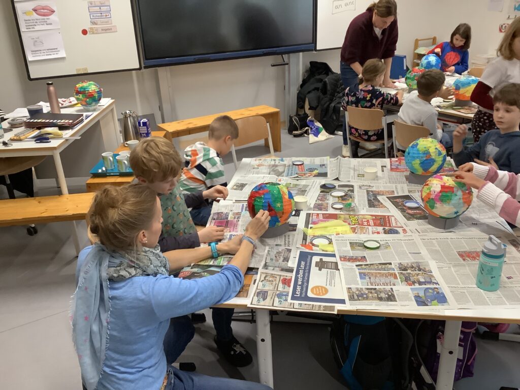Gleich zu Beginn des Schulstarts nach den Herbstferien legten die Kinder der Klasse 2a farbenfroh-kleisternd los. So entstanden glitzernd-kunterbunte Sterne, Planeten und Monde.