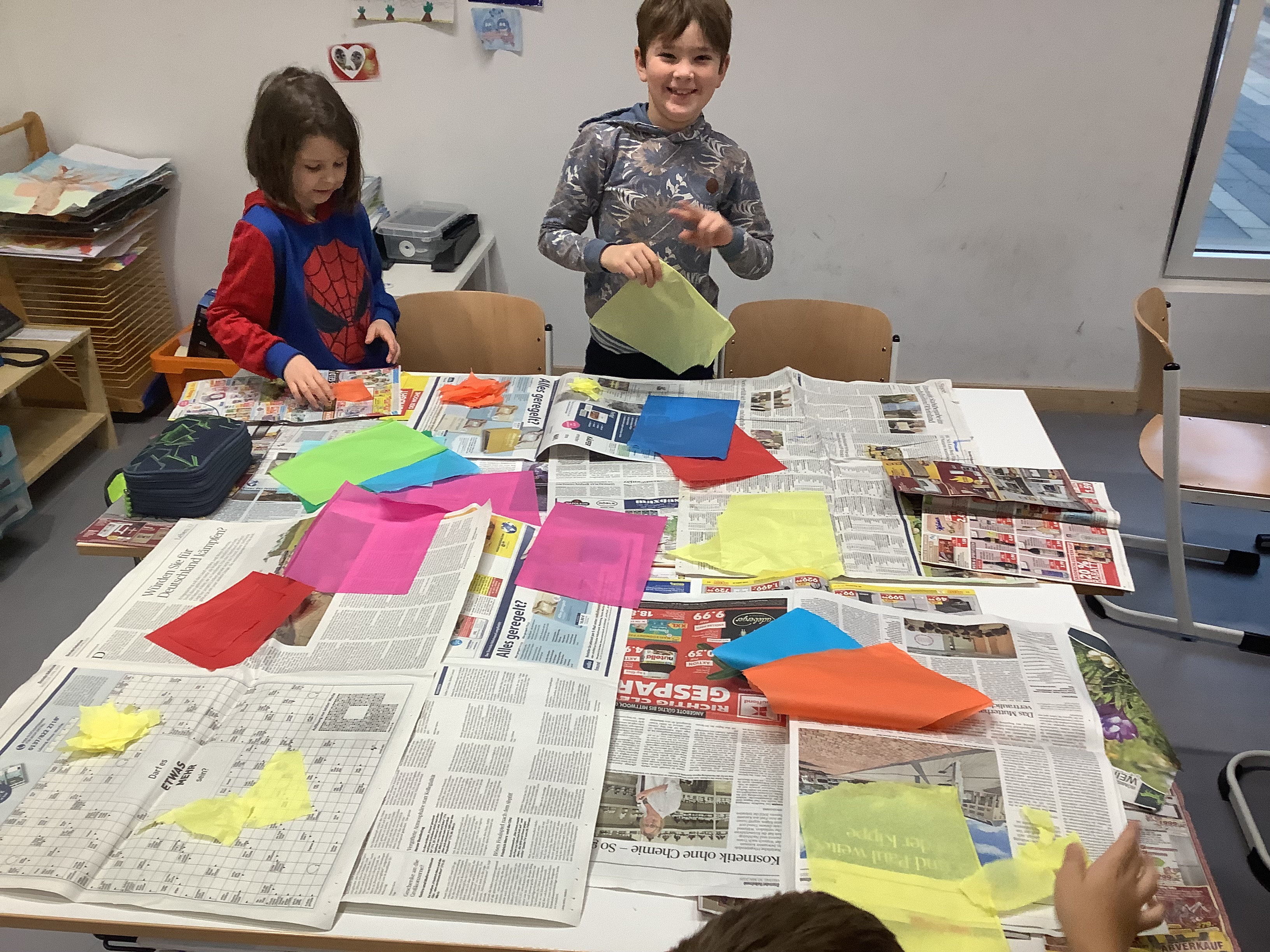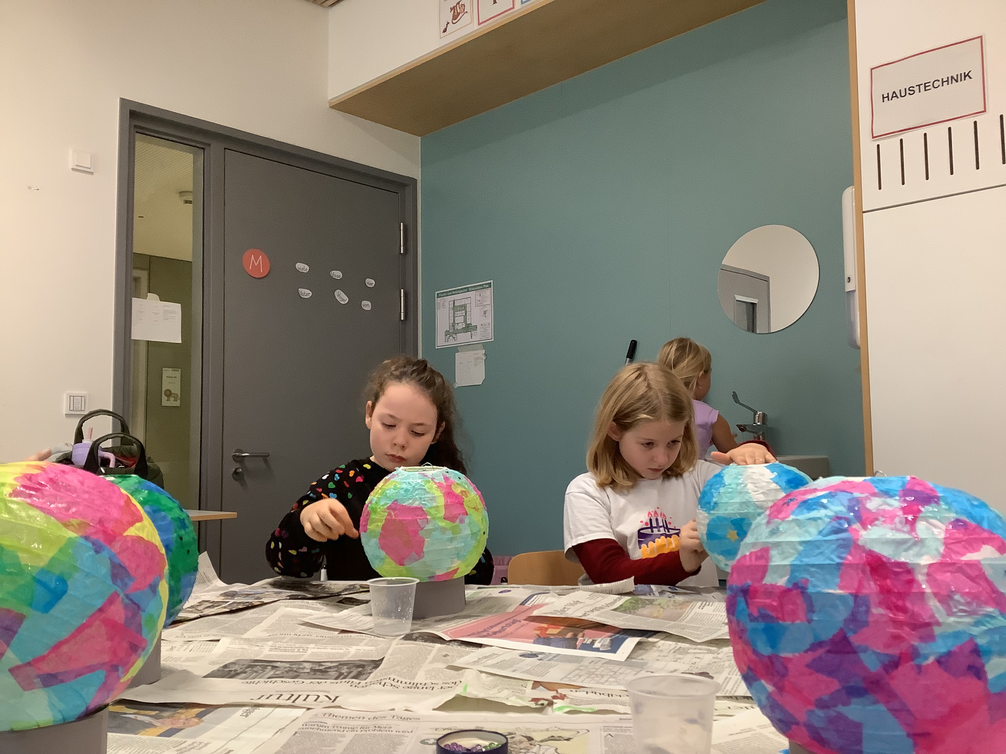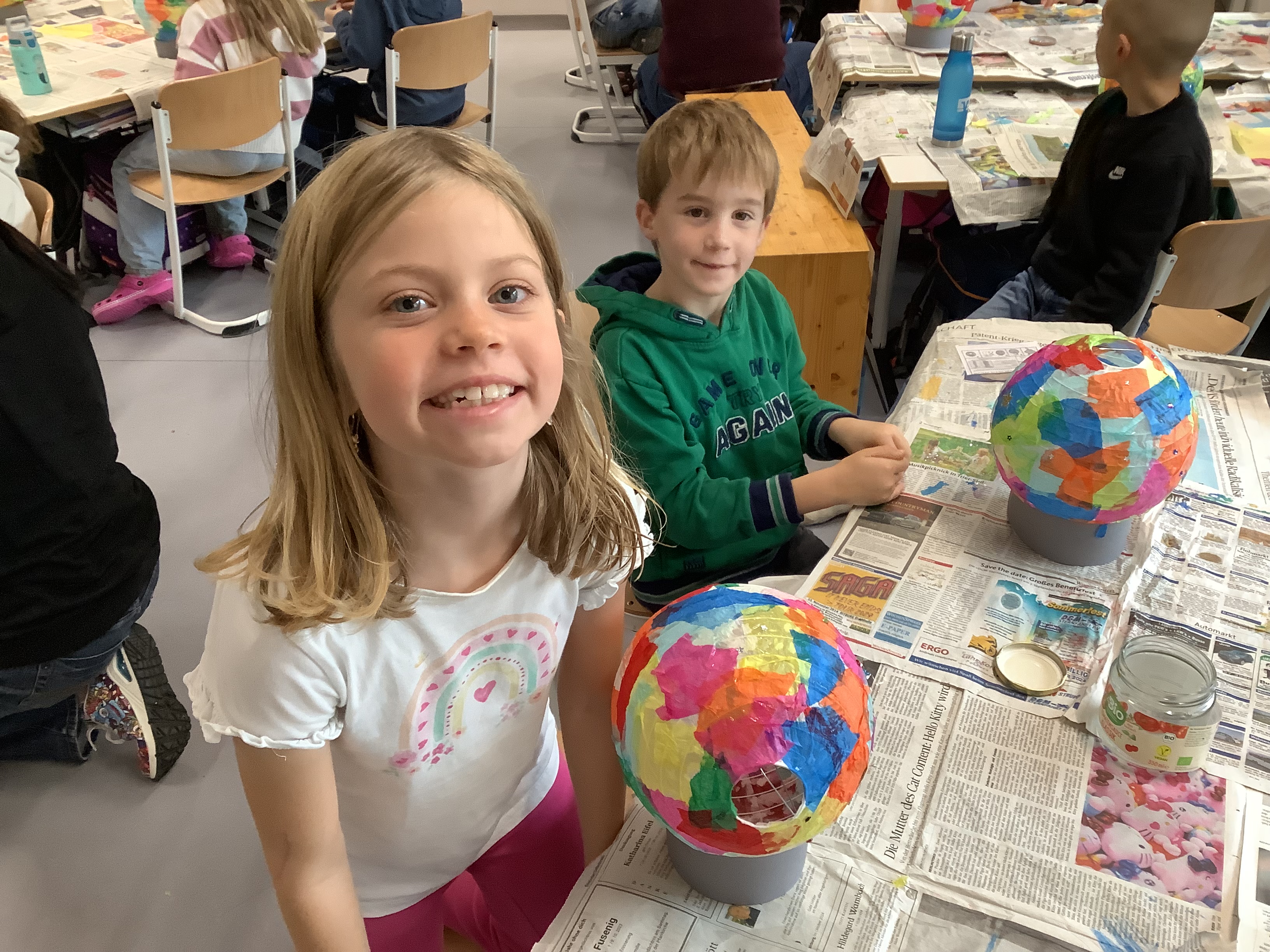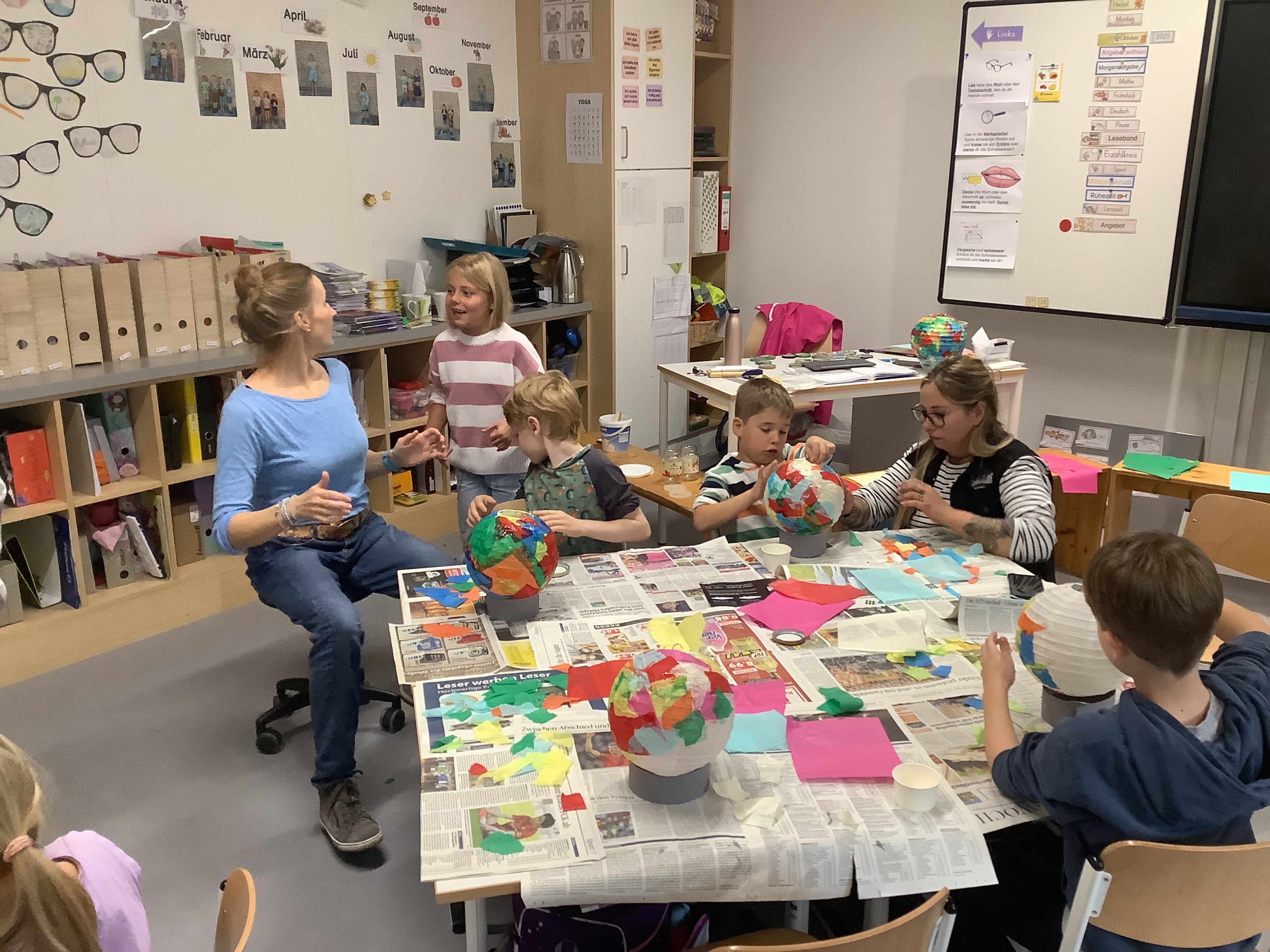 Gleich zu Beginn des Schulstarts nach den Herbstferien legten die Kinder der Klasse 2a farbenfroh-kleisternd los. So entstanden glitzernd-kunterbunte Sterne, Planeten und Monde.